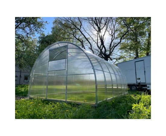 The arched polycarbonate greenhouse, made of galvanized metal square tube (thickness 0.8 mm and size 2x4 cm), is resistant and ideally suited to the climate conditions of the Baltic States. A greenhouse is available in different lengths, depending on customer choice. The greenhouse is equipped with two doors (width 0.9 m) and 2 ventilation windows built into the door at both sides of a greenhouse. The greenhouse can be installed directly onto soil or on a foundations. To purchase a greenhouse with a length of more than 12 meters, please contact us by phone or by e-mail.