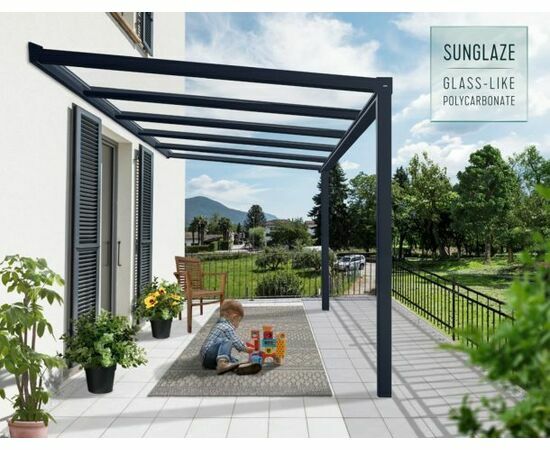 Masīvs, elegants, ļoti izturīgs terases jumts ar unikāli caurspīdīgu pārklājumu. Vienkāršs dizains, kas veido elegantu telpu, kurā var burtiski apkampt dabu, vienlaikus atrodoties sausumā. Kristāldzidrie jumta paneļi ir izgatavoti no polikarbonāta, kas ir praktiski nesalaužams, turklāt laiž cauri 100% gaismas, tātad tiem ir visas stikla priekšrocības un nav neviena stikla trūkuma, līdz ar to šis pārklājums ir ļoti drošs. Tas ir triecienizturīgs, tam nekaitē skarbi laikapstākļi un ultravioletais starojums, tātad tas kalpos gadiem ilgi. Šis modernais terases jumts ir izstrādāts, lai to izmantotu visu gadu. Tas ļauj pavadīt vairāk laika ārā atpūšoties, pusdienojot, rīkojot pārtijas un sanākšanas vai vienkārši baudot skatuuz dārzu. Padariet savu māju un pagalmu stilīgāku vienā nedēļas nogalē un gadiem ilgi baudiet plašo skatu!